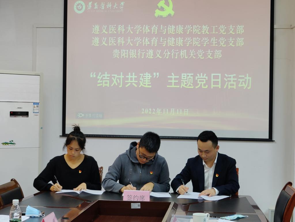 随后,在全体党员的共同见证下,贵阳银行遵义分行机关党支部党员代表刘艺同志宣读共建协议,三位党支部书记签订《党支部结对共建协议》。