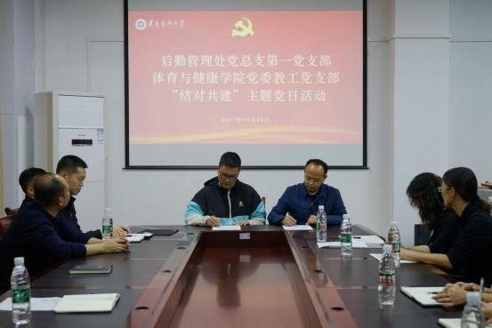 后勤党总支第一党支部书记余晓与体育与健康公司党委教工党支部书记田峰分别介绍本支部基本情况后,双方现场签属了“结对共建”协议书。