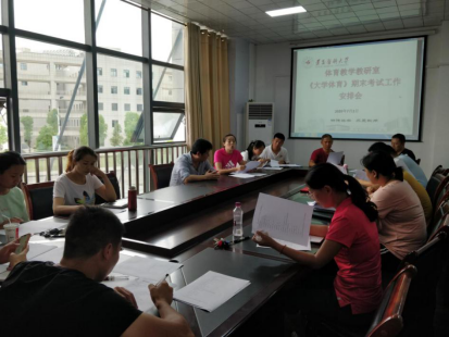 为保证疫情期间《大学体育》课程期末考试的顺利进行,针对部分未返校同学情况的特殊性及员工线上学习情况,7月2日体育教学教研室在会议室召开《大学体育》期末考试工作安排会。首先,教研室负责人尚菲对本学期考试内容、成绩组成部分进行解释说明,并针对未返校同学的考试作出统一要求。接着各位公体教师对线下4周教学内容的项目考试评分进行讨论,确定统一、公平、公正的评分指标。最后黄涛副经理强调教师评分时需要让考试分数呈正态分布,以保证考试评分的科学性。