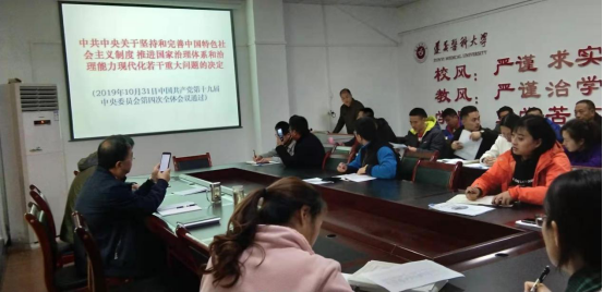 11月18日,体育学院召开专题学习党的十九届四中全会精神。此次学习以“深入学习十九届四中全会精神 不断提高工作履职能力”为主题,通过学习原文、重点发言和集中研讨相结合的方式,重点学习《中共中央关于坚持和完善中国特色社会主义制度 推进国家治理体系和治理能力现代化若干重大问题的决定》(以下简称《决定》)等内容并结合履职实际开展集中研讨,贯彻落实四中全会精神,提高科学高效履职能力,推动学院各项工作高质量发展。