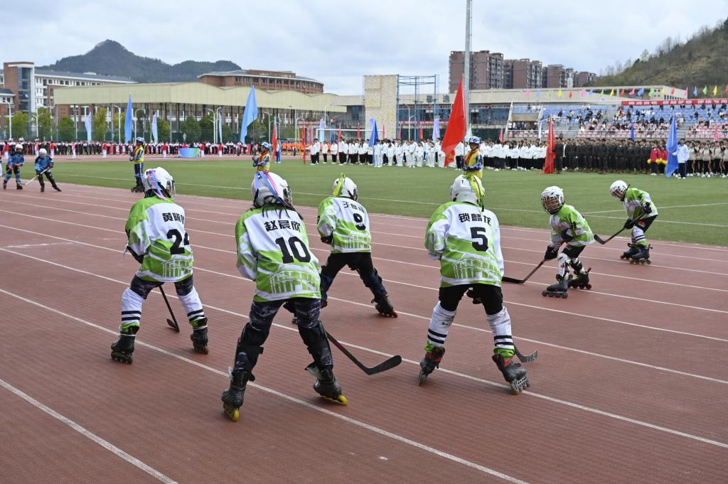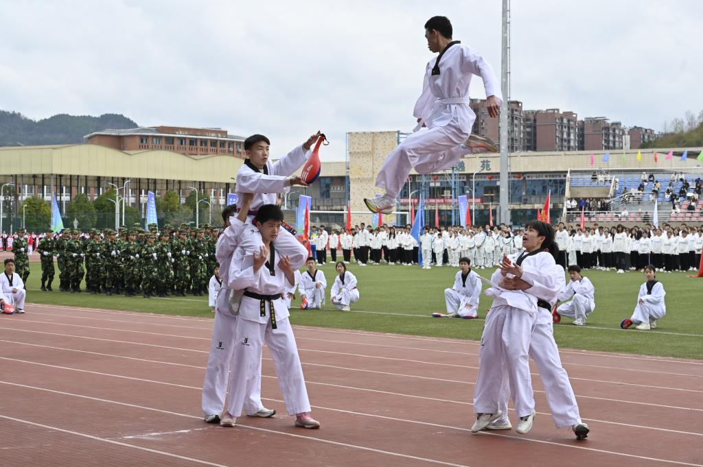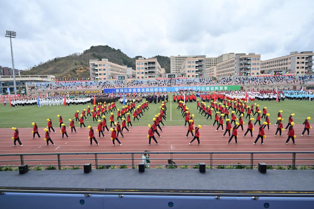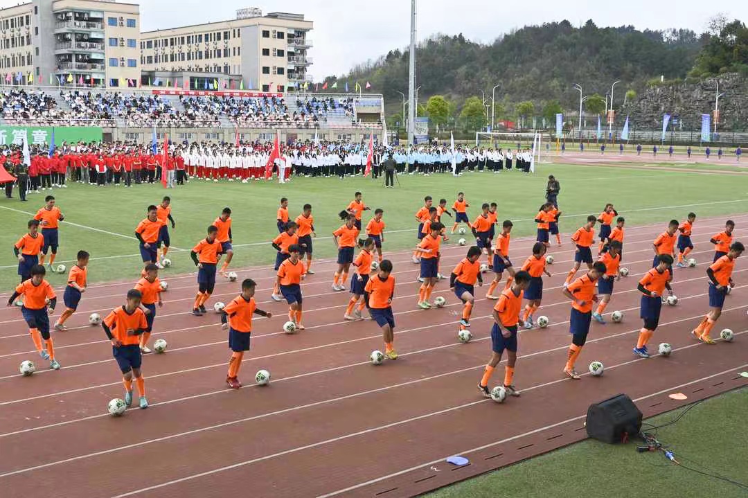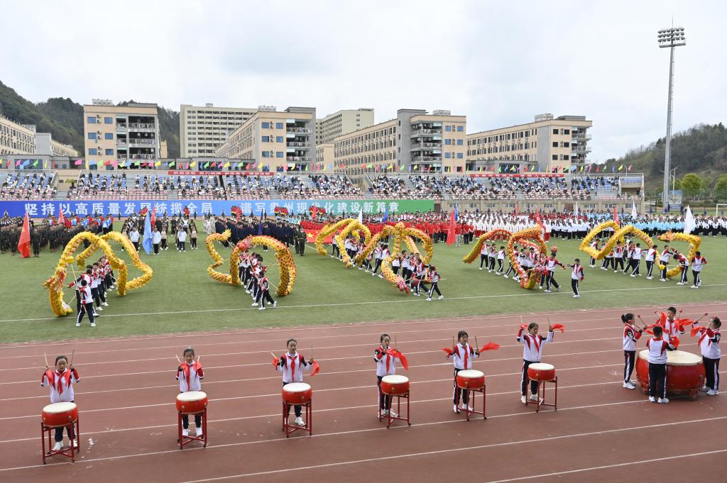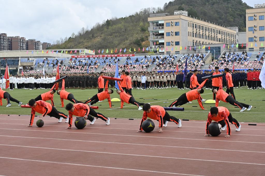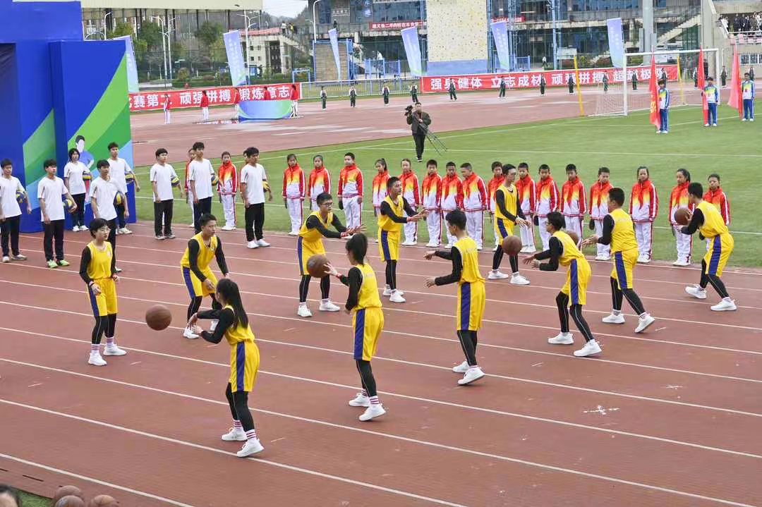 启动仪式上,特色体育运动项目的精彩展演,点燃了师生们的运动热情。以“课间十分钟”为主题的滚铁环、跳皮筋、丢沙包、跳格子、乒乓球、羽毛球、网球等,展现出学子健康快乐、茁壮成长的精神面貌;翻腾飞舞的中国龙、强劲有力的中国鼓,行云流水的太极、蔑鸡蛋、推食爬、高脚等传统民族体育项目,彰显了中华儿女的民族精神和黔北大地的独特风貌。
