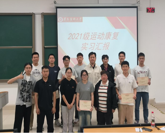 汇报会上,2021级运动康复专业14个实习点员工代表依次上台,他们分别从实习单位基本情况、实习过程的思考与感悟、实习收获与不足、给即将实习的2022级同学的建议等方面进行了汇报,他们结合各自所在医院的临床实习经历和各运动队运动防护及康复保障经历,分享了取得的实践成果与心得体会,他们从康复评估、运动治疗、患者沟通、训赛保障、助力夺冠等多个角度展开分享,充分展现了他们专业技能、职业素养、人际交流、生涯规划等方面取得的成果。